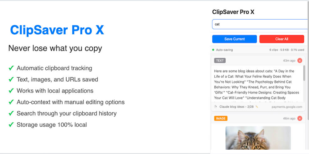 ClipSaver Pro X is a $2.99 one-time Chrome extension. Autosaves clipboard content (text, URLs, images) locally—manual saves for sensitive sites (e.g., Gmail). Data stays on your device—private, no cloud. Use at your own risk; not liable for data loss or site quirks. Free updates, no promises. Email [email protected] for help. Downloading & Paying = agreement. All purchases subject to Chrome Web Store terms. Payments handled via PayPalRight to Withdrawal: As per EU consumer protection laws, consumers have the right to withdraw from digital purchases within 14 days. However, by purchasing and activating ClipSaver Pro X, you expressly consent to immediate access to this digital content and acknowledge that this waives your right of withdrawal.